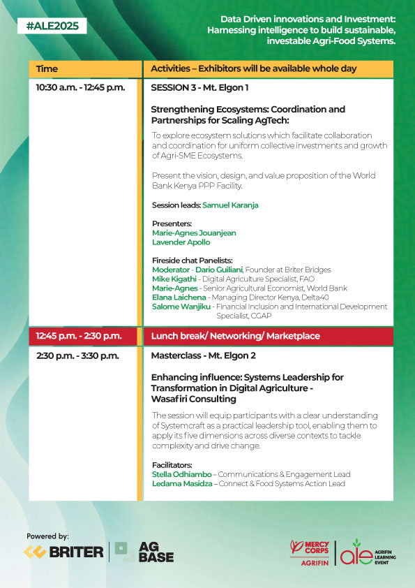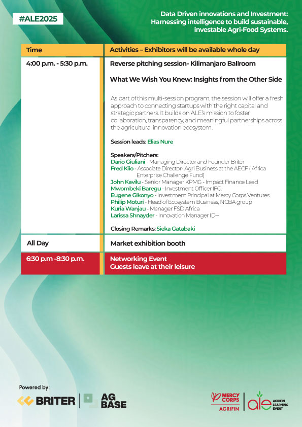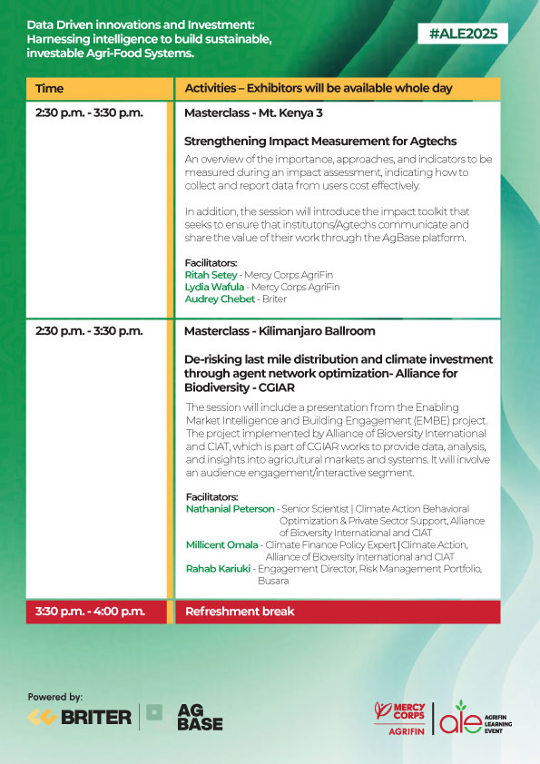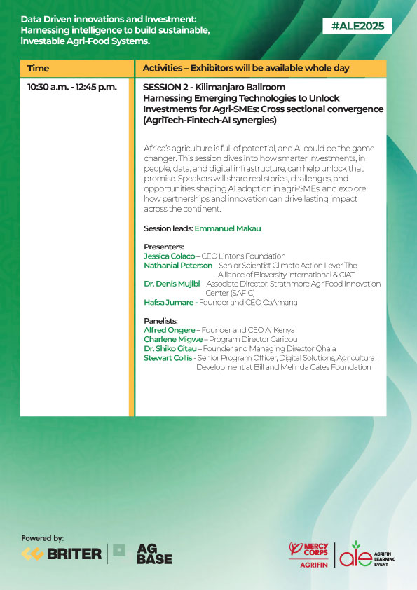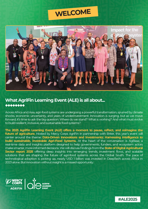 The AgriFin Learning Event (ALE) brings together innovators, farmers, financial service providers, agribusinesses, and policymakers to share insights, foster partnerships, and scale digital solutions for smallholder farmers across Africa.
